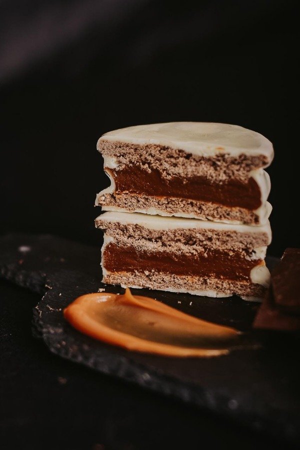 Alfajor clásico de dulce de leche con cobertura de chocolate blanco.
