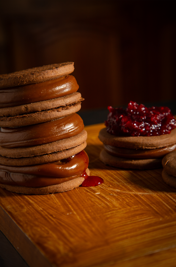 Alfajor de tres capas relleno de dulce de leche y dulce de frambuesa, con cobertura de chocolate semiamargo.